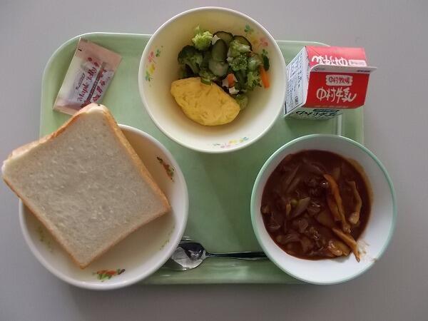 本日は小中同じ献立で「食パン、ビーフシチュー、オムレツ(チーズサラダ)、メープルジャム」でした。