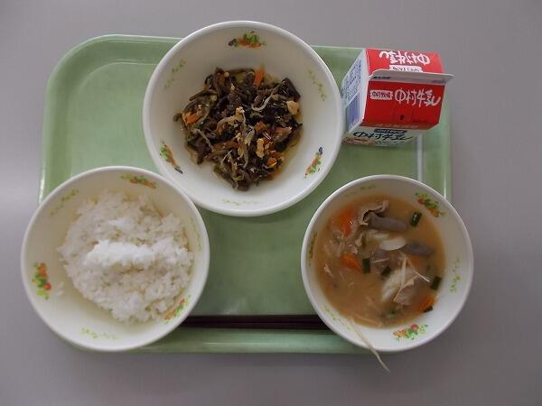 小学部の献立は「麦ご飯、さんぺいじる、鶏肉のちゃんちゃん焼き、ひじきのり」でした。