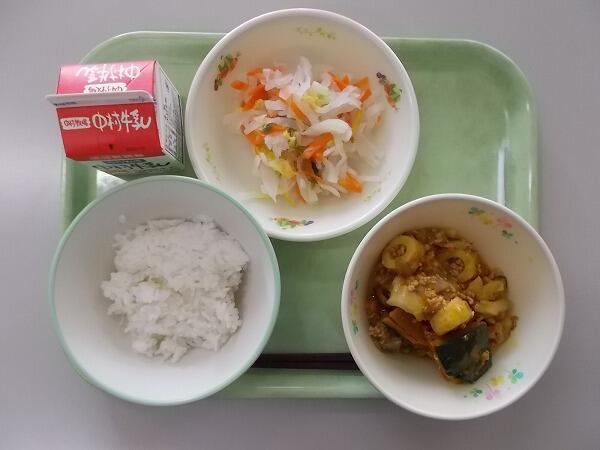 小学部の献立は「麦ご飯、カボチャのそぼろに、ゆず和え」でした。