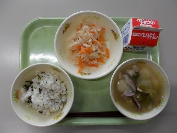 中学部の献立は「大根葉ご飯、具雑煮、紅白なます」でした。