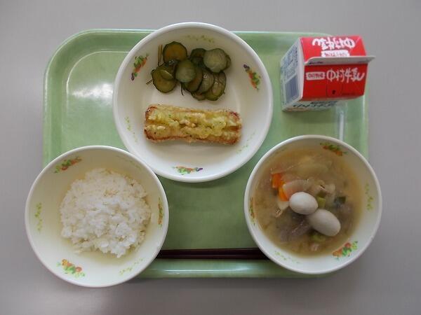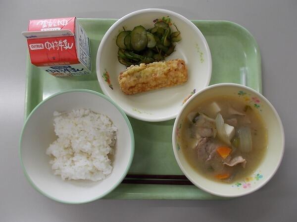 小学部の献立は「麦ご飯、豚汁、ちくわの磯辺揚げ、こんぶ和え」でした。