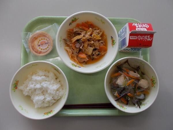 小学部の献立はリクエスト献立で「減量麦ご飯、春雨スープ、豚キムチ炒め、焼きプリンタルト」でした。