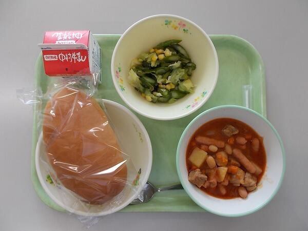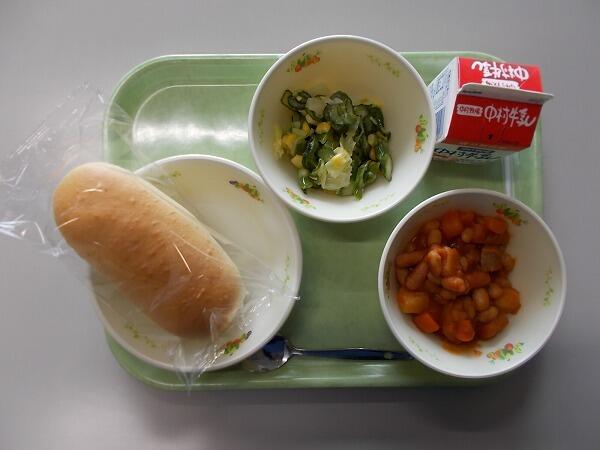 小学部の献立は「ミルクパン、ポークビーンズ、グリーンサラダ」でした。