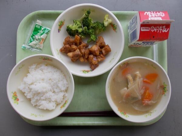 小学部の献立は「麦ご飯、大根の味噌汁、チキン南蛮(ゆでブロッコリー)、ノンエッグタルタルソース」でした。