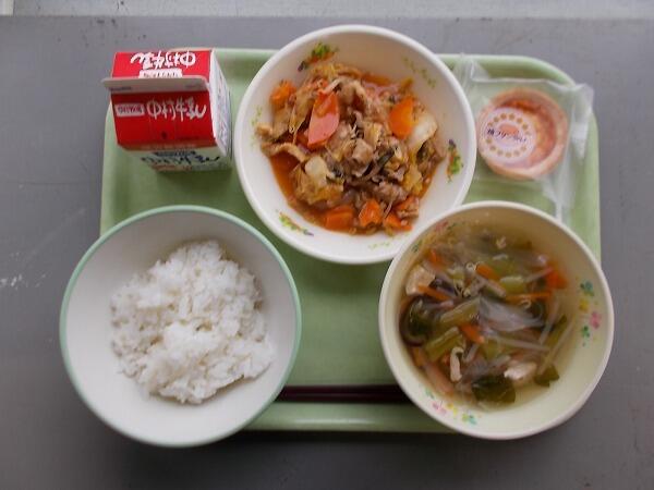 中学部の献立は「麦ごはん、中華卵スープ、牛肉トッポギ」でした。