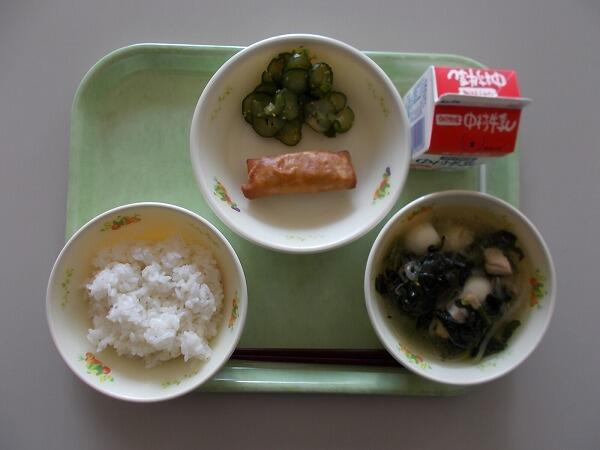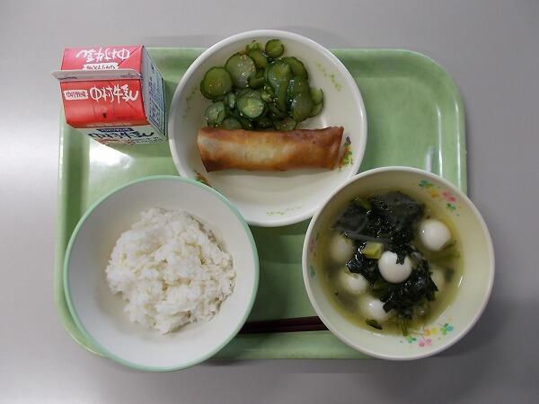 小学部の献立は「麦ごはん、鶏肉の塩スープ、揚げ春巻き、添えきゅうり」でした。