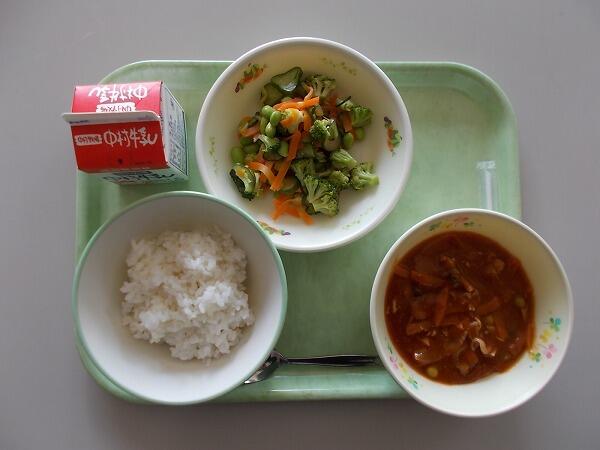 小学部の献立は「麦ご飯、豚肉とズッキーニのカレー、ブロッコリーサラダ」でした。