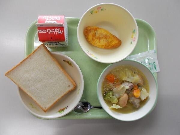 小学部の献立は「食パン、ポトフ、トマトオムレツ、日向夏みかんジャム」でした。