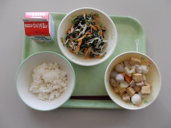 中学部の献立は「麦ご飯、里芋のそぼろ煮、茎わかめの酢の物」でした。