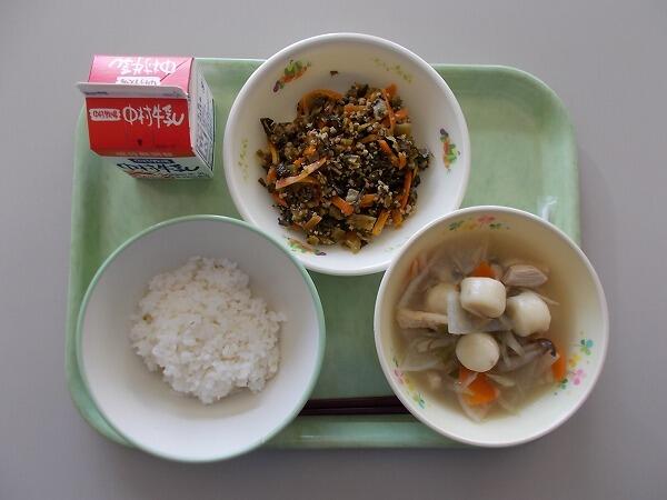 中学部の献立は「麦ご飯、芋餅汁、高菜の油炒め」でした。