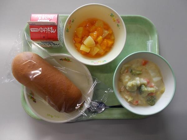 小学部の献立は「黒糖パン、冬野菜のクリーム煮、フルーツジュレ」でした。