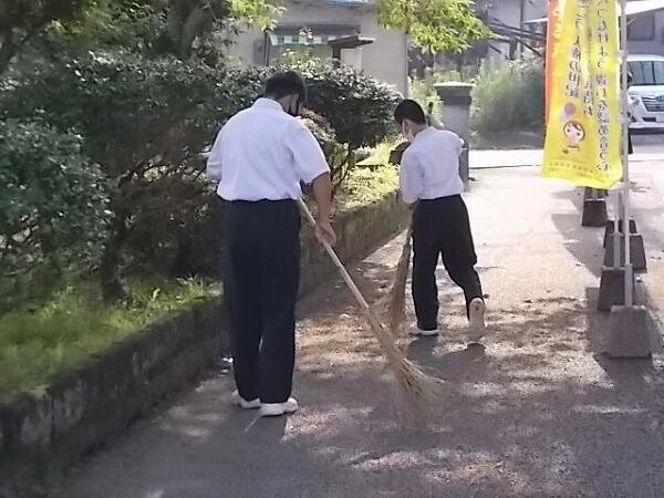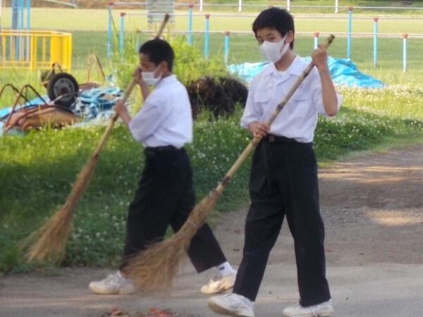 今日も地域の方々に見守られながら、登校してきました。小学生は掲揚台に旗揚げを、中学生は落ち葉掃きをがんばっていました。