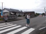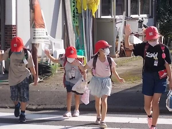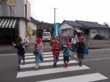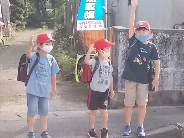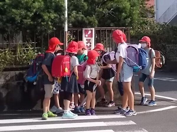 徒歩の中学生が偶然にも小学生の登校班と一緒になる(写真右上)と、ひときわ安心です。小中一貫校のよさです。やがては、この小学生が頼もしい中学生となっていくのでしょうね。