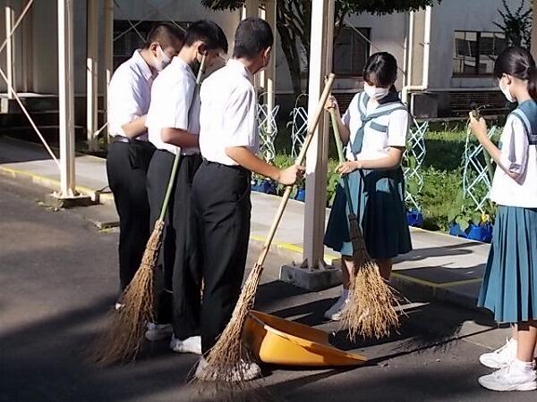 三納地区の高齢者クラブの方々から、清掃用具(竹ぼうきとぞうきん)を学校に寄贈していただきました。毎年寄贈してくださっているそうで、ありがとうございます。中学部の生徒会長と副会長、小学部の生活・運営委員長と副委員長が代表で受け取りました。生徒会長が、「大切に使わせていただきます」とお礼を述べたとおり、みんなで学校をきれいにしていきます。