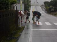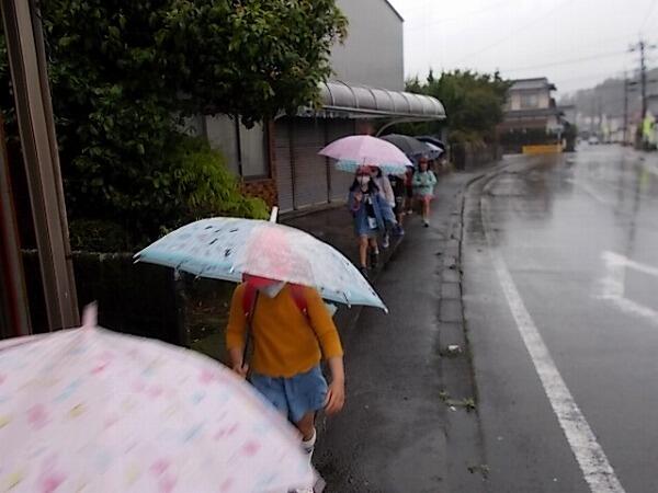 雨の中、歩いて登校する子どもたち。風があるときは笠の向きを変えたり、靴下がぬれたりすること、学生時代ならではの貴重な経験です。こんな経験を通して、困難にも負けず、たくましく生きる力を身に付けていくのだと思います。