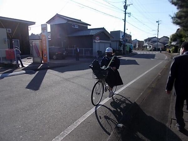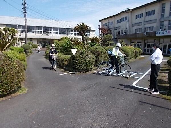 中学部は5校時に自転車実技の試験を行いました。旧中学校の前庭に実技試験のコースを作り、一時停止や左右確認、横断歩道の渡り方等全員で確認しました。以下のその時の様子です。