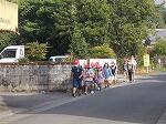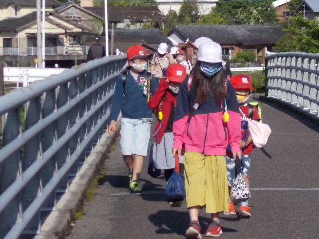 三納川を渡ってくる子どもたちです。遠くからでも、5・6年生の班長、副班長が下級生の面倒を見ながら集団登校しています。