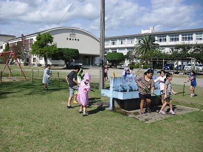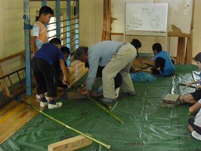今年の竹細工は、「水鉄砲づくり」です。小野さんは、何日も前から竹を切るなど、子どもたちのために、準備をしてくださいました。水鉄砲は、のこぎりを使って、長い竹を節のところで切らなければなりません。初めは、とても危なっかしい手つきでしたが、教えていただきながら、上手に切ることができるようになりました。作ったら、運動場に出て、元気よく水を飛ばしていました。