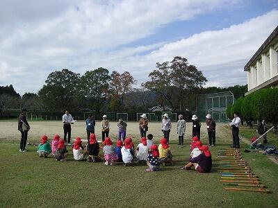 11月11日(水)に小学3・4年生が、三納地区の高齢者の方々と一緒に西運動場(旧中学校運動場)でグラウンドゴルフをしました。2校時に3年生、3校時に4年生が参加しました。