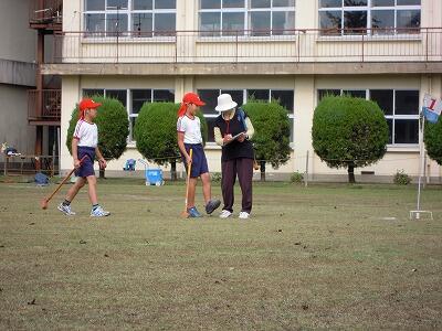4年生は昨年度もやっていますが、3年生はほとんどの児童が初めての経験です。最初は、なかなかうまくボールに当たらなかったり、どれくらいの強さで打てばいいのかわからなかったりしましたが、高齢者の方々から優しく教えていただきながら、少しずつみんな上手になっていきました。やはり、高齢者の方々のクラブさばきは、さすがに見事なものでした。