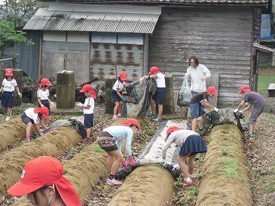 担任の先生の説明を聞いて、大きな黒いマルチシートをはがした後、1年生も4年生も一生懸命、汗びっしょりになりながら、芋を掘りました。みんなでがんばって、たらい5杯分の芋を掘り上げました。