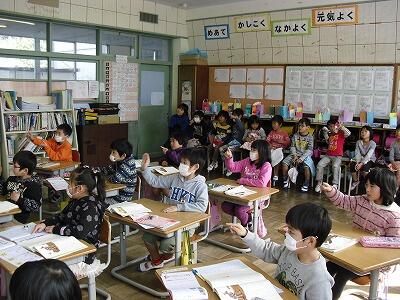 3校時は、多目的ホールに移動して、グループに分かれて、1年生が先日地区の高齢者の方々に教えていただいた「かるた」や「こま」、「どんぱち」、「はねつき」などの昔の遊びを一緒にしました。ここでも、1年生はお兄さん、お姉さんらしく、優しく、一生懸命に教えていました。4月になって、年長児さんが入学してくるのが、とても待ち遠しそうでした。