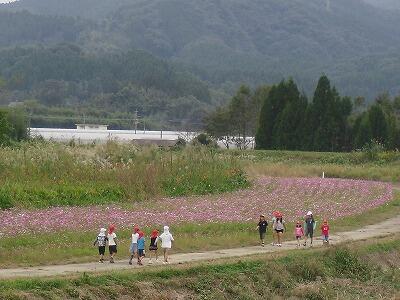 小学生が5、6名の16班に分かれ、6か所のチェックポイントを通って、点数を競いました。チェックポイントには、①コスモス畑の中のウォーキング②三納川での水コップリレー③ネイチャーゲーム④竹とんぼ⑤わたがし⑥あみだくじなど、楽しいものがたくさんあります。一昨年度から、地域づくり協議会の方々にもスタッフとして入っていただき、合同で実施しています。毎年、いろいろなアイデアで子どもたちを楽しまていただき、ありがとうございます。