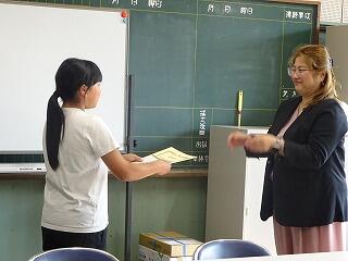 高鍋西都法人会の方が、令和6年度「税に関する絵はがきコンクール」で奨励賞をもらった2人と会長賞をもらった一人児童の表彰にきてくださいました。