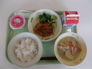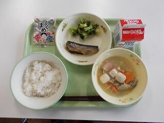 今日の献立は「麦ごはん 豚汁 いわしの生姜煮 ゆでブロッコリー 節分豆」でした。