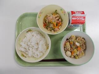 今日の献立は、麦ごはん、肉じゃが、ごまマヨ和えでした。