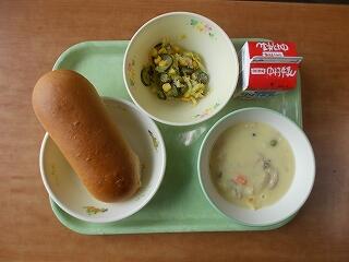 本日の献立は、ミニミルクパン、コーンポタージュ、かぼちゃひき肉フライ、ゆでブロッコリーでした。
