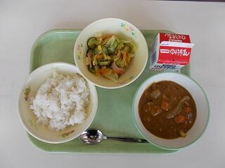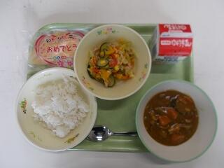本日の献立は、麦ごはん、チキンカレー、ピーマンサラダ、お祝いゼリー(中学部のみ)でした。