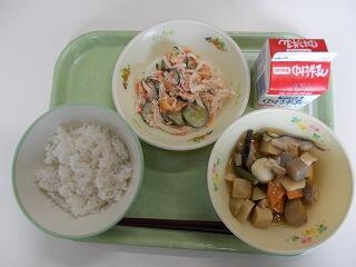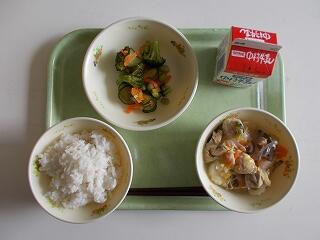 今日の献立は「麦ごはん 塩肉じゃが きゅうりとわかめの酢の物」でした。