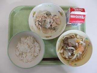 本日の献立は、減量わかめごはん、山菜うどん、きんぴらごぼうです。