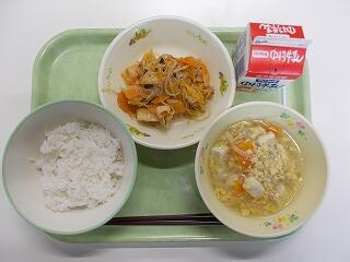 今日の献立は「麦ごはん たまごスープ 豚キムチ炒め」でした。