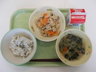 今日の献立は「大根葉ごはん 炒り豆腐 ほうれん草のみそ汁」でした。