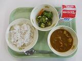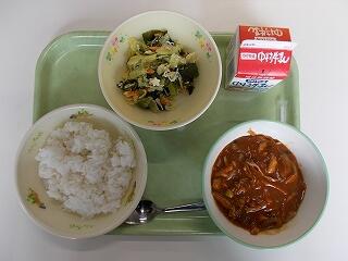 本日の献立は、麦ごはん、ハヤシライス、グリーンサラダ、お祝いゼリー(小学部のみ)でした。1年生は、お祝いゼリーを大変喜んでました。