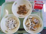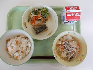 本日の献立は、たけのこおこわ 豚肉とキャベツの味噌汁、いわしの梅煮、おかか和えでした。