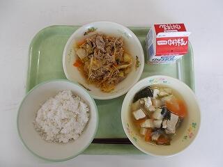 今日の献立は、麦ごはん、茎わかめのスープ、ホイコーローでした。