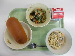 今日の献立は「ミニ黒糖パン クリームスパゲッティ 海藻サラダ」でした。