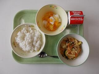 本日の献立は、麦ごはん、マーボー豆腐、フルーツゼリー和えでした。