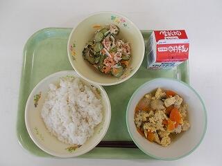 本日の献立は、麦ごはん、じゃがいものそぼろ煮、和風大根サラダでした。野菜がたくさんあり、今日もおいしいかったです。