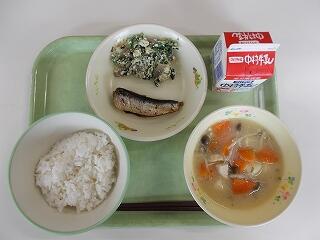 今日の献立は「麦ごはん いももち汁 いわしの生姜煮 白和え」でした。