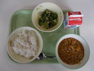 今日の献立は「麦ごはん ひき肉と豆のカレー 花野菜サラダ お祝いクレープ(小学部のみ)」でした。