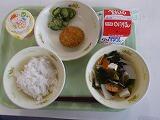 本日の献立は、麦ごはん、若竹汁、彩りメンチカツ、添えキュウリ、豆乳プリンでした。今日もおいしかったです。