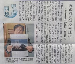 2月3日、写真短歌集「月」について、宮崎日日新聞社様が紹介してくださいました。また、昨年度の「雪」と共に、西都市図書館、宮崎県立図書館に置いていただけることになっています。来館された方々に、手に取って読んでいただけるように、また、貸し出しができるようになっています。うすい冊子ですので、目立たないのですが・・・。