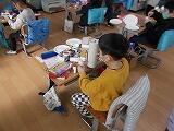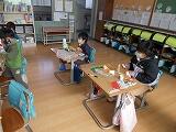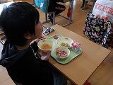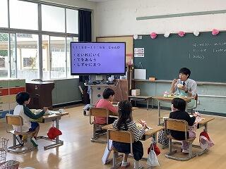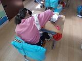1年生では、一つ一つを丁寧に教えてくださいます。ちょうどストローの使い方を習っているところでした。上手にビニールの袋を取り外さずに中央に寄せて使っていました。