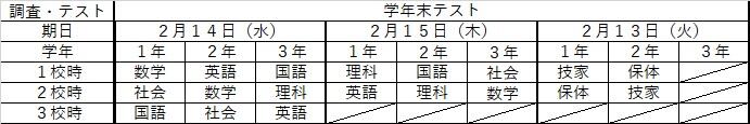 2月14日より、中学部で学年末テストが始まりました。これまでの学習の成果を発揮してほしいと思います。時間割は次のとおりです。