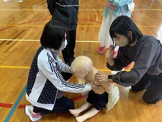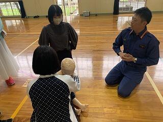 一人ずつ実技に挑戦した後、シュミレーションを行いながら119番通報、児童への対応、AEDなど実際の場面を想定して動いてみました。