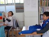そして、気道異物の除去について、実技を行いました。まずは、咳をさせるとことが異物除去には最も効果的だそうです。それでも無理な時には、119番通奏を依頼するとともに、背部叩打法を試みて、効果がなかれば腹部突き上げ法を試みて、異物の除去を試みるとのことでした。